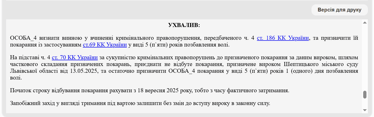 Суд проаналізував матеріали справи та визнав жінку винною за ч. 4 ст. 186 КК України. Її засудили до 5 років позбавлення волі. Оскільки жителька Львівщини перебувала на іспитовому терміні через інший злочин, то остаточне покарання — 5 років та 1 день позбавлення волі.
