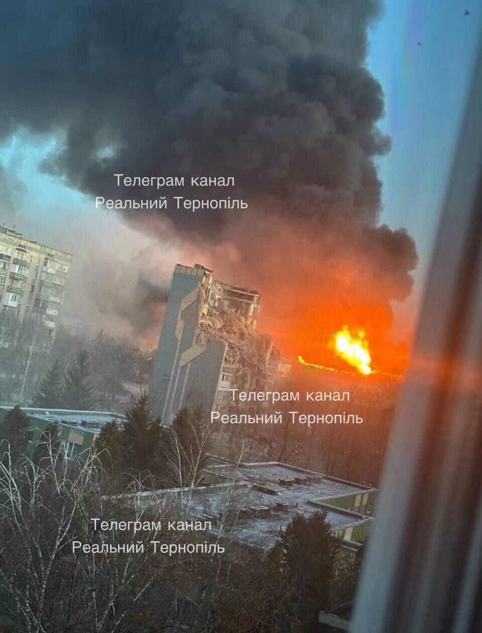 Тернопіль. У місті – просто ПЗДЦ. Сильне руйнування багатоповерхівки. Пожежа і задимлення над містом;
