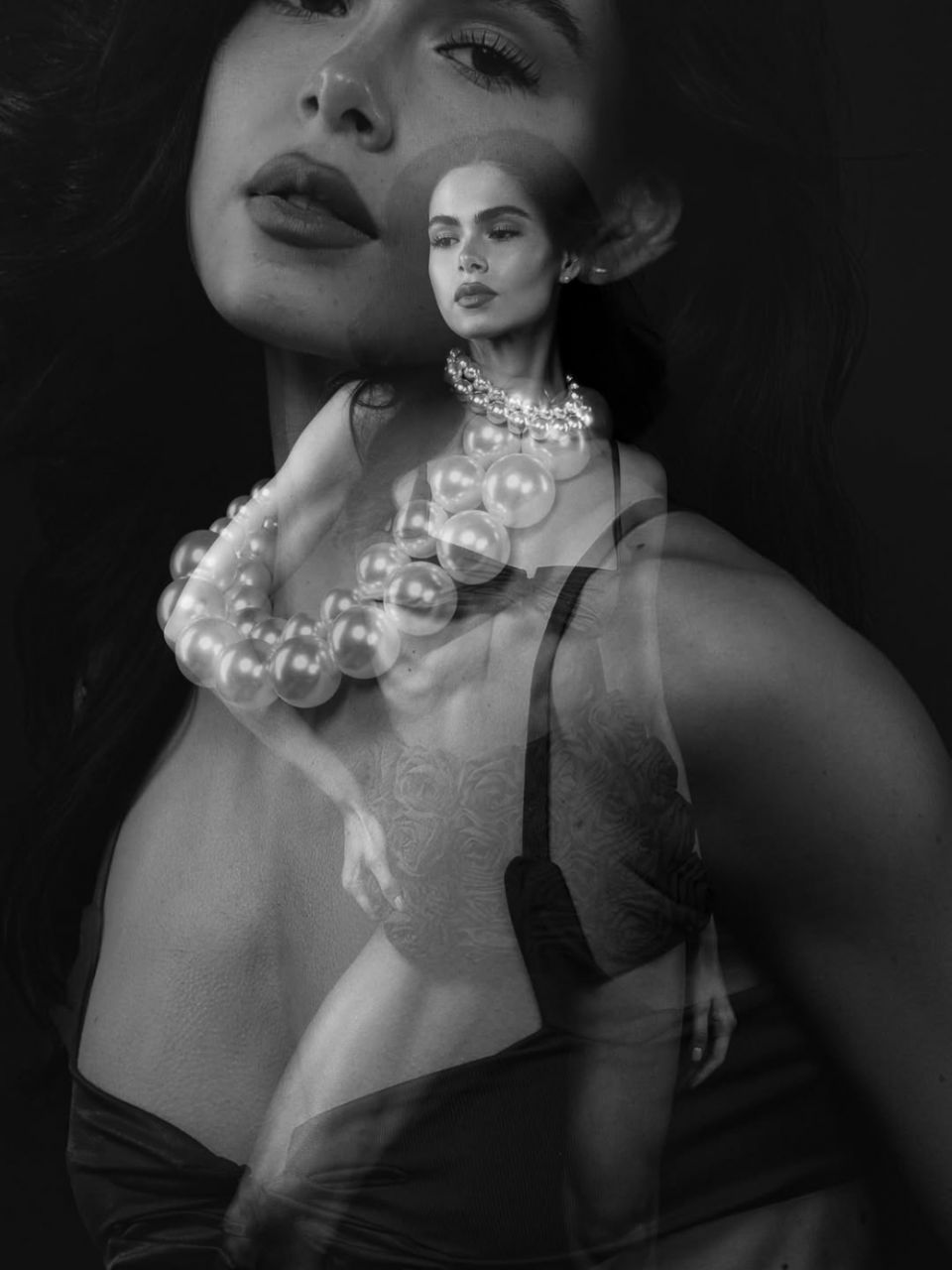 Для фотосесії обрала дуже тісний ліф і мініспідницю з фактурними трояндами спереду. Аутфіт доповнила масивним кольє, легкими локонами і елегантним макіяжем.