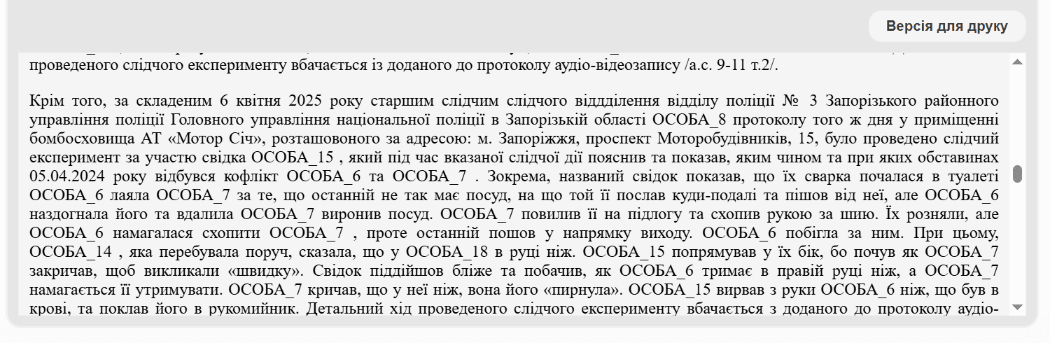 Злочин стався у квітні 2025 року в приміщенні бомбосховища у Запоріжжі. Обвинувачена, яка раніше вже була судима за умисне тяжке тілесне ушкодження, під час конфлікту завдала потерпілому одного удару ножем у грудну клітку, що призвело до його смерті.