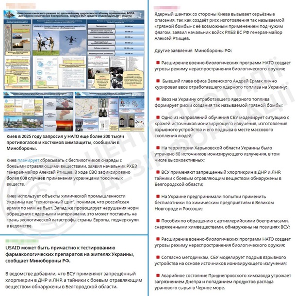 Російські медіа поширюють заяви міноборони РФ зі звинуваченнями на адресу України про нібито "підготовку до використання зброї масового ураження". Про це повідомляє Центр протидії дезінформації при РНБО України в Telegram.