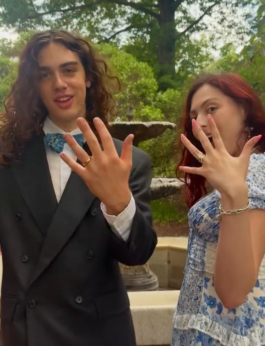 Поруч із нею позував коханий. Він був одягнений в офіційний костюм та сорочку з метеликом та коричневих туфлях. Щасливі закохані цілувалися та демонстрували обручки на підмізинних пальцях.