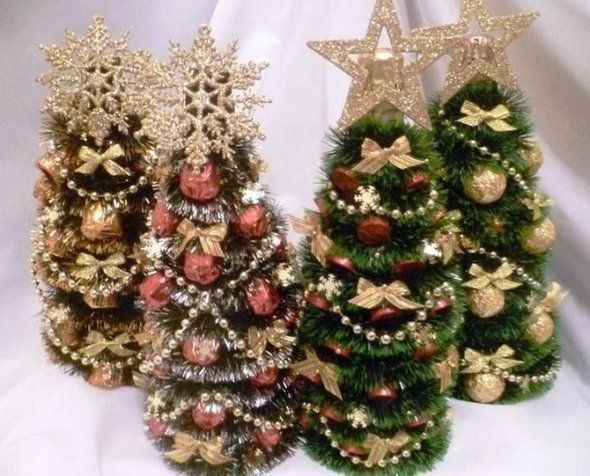 Зі стандартної пляшки шампанського і традиційних новорічних прикрас можна зробити гарну ялиночку. Для цього потрібна товста і довга зелена мішура "дощик". Знадобляться також клейовий термопістолет та мініатюрні ялинкові іграшки. Однак, їх можна замінити блискучими круглими цукерками.