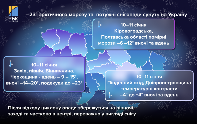 "Кіровоградська, Полтавська області - там вночі та вдень буде не такий інтенсивний мороз - 6-12 градусів (нижче нуля, - Ред.)", - зауважила Птуха.