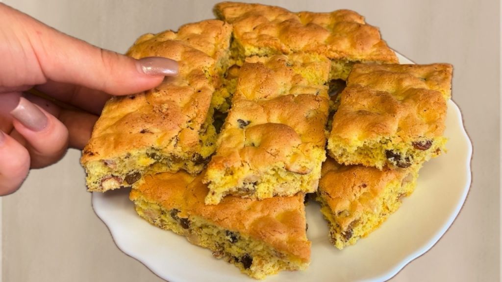 Все поєднується міксером. Додати до суміші 100−150 г родзинок з вишнею, 80 г подрібнених горіхів. Перемішати та поступово додати 300 г борошна з 2 чайними ложками розпушувача. Замісити тісто, розкатати в пласт приблизно до 0,7 см. Розрізати на шматочки, які вам подобаються, та випікати до підрум'янення. Перевертаємо і знову в духовку.
