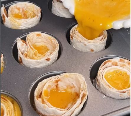 Яйця збити з молоком до однорідності. Бекон або шинку дрібно нарізати. У форму викласти тортильї, злегка притискаючи.