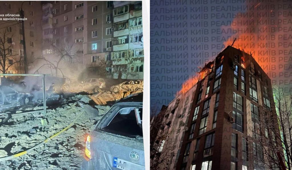 Оновлено 7.40. За повідомленням ДСНС, у Києві внаслідок атаки РФ в Голосіївському районі сталося влучання в торець 17-поверхового житлового будинку, сталося незначне руйнування покрівлі та стіни технічного поверху, пошкоджено вікна верхніх поверхів. Також пошкоджено поруч припарковані автомобілі.