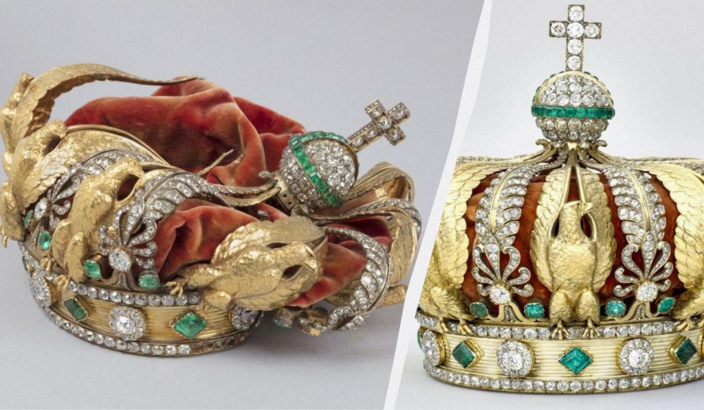 Убор ніколи не використовувався для коронації. Але він став символом імператорської влади, перш ніж потрапити до колекції Лувру в 1988 році. Протягом десятиліть корона вражала мільйони відвідувачів. Вона має у складі 1354 діаманти та 56 смарагдів, що чергувалися з вісьмома пальметами та величними золотими орлами.