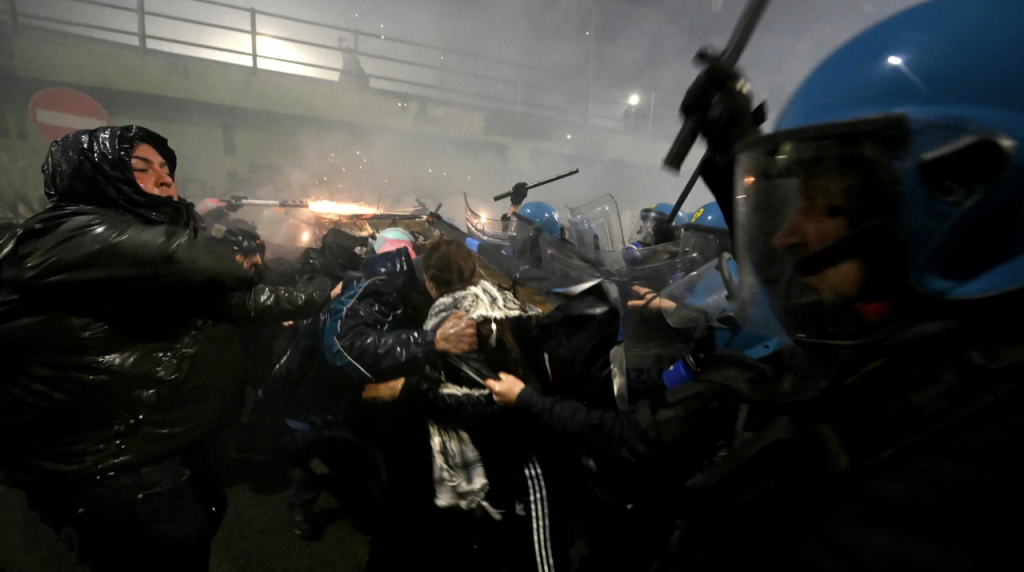 Вдень близько тисячі учасників вийшли на мирний марш проти впливу Олімпійських Ігор на навколишнє середовище та присутності американських агентів ICE в Італії.