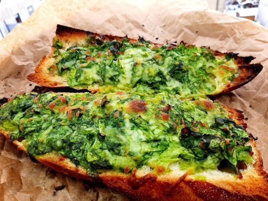 Багет розрізати навпіл і вийняти м'якуш. Заповнити начинкою з подрібненої зелені, натертих часнику та сиру, додавши оливкову олію та вершкове масло, а також трохи молока. Запекти в духовці до готовності.