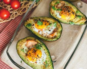 Запечені авокадо із яйцем, беконом і сиром