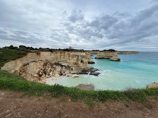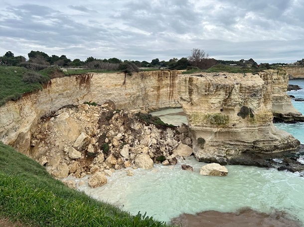 ЗМІ зазначив, що природна формація з карстового вапняку, вимита водами Адріатичного моря, Торре Сант-Андреа, яку називають "аркою кохання", обвалилася в суботу ввечері внаслідок сильних дощів і вітру.