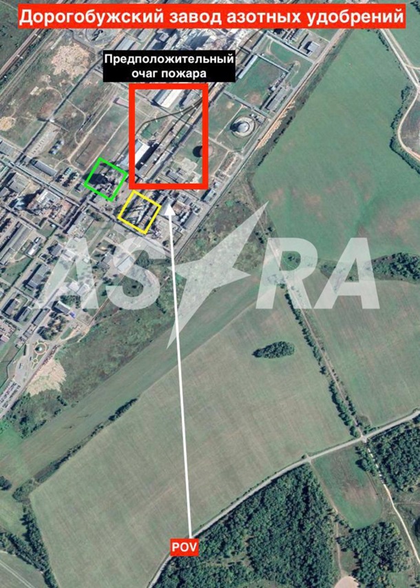 За даними аналізу, на території хімзаводу Дорогобуж зафіксовано пожежу на об'єктах. Знімки з місця атаки, опубліковані місцевими Telegram-каналами, були зроблені з дороги приблизно за 1,3 км.
