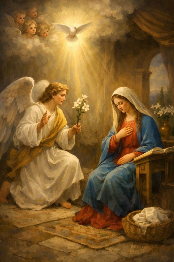 Подія Благовіщення описана в Євангелії від Луки. Архангел Гавриїл був посланий Богом до Назарета, щоб сповістити Марії, що в неї станеться зачаття від Святого Духа і народить Сина. Її відповідь - "Нехай буде мені за словом твоїм" - стала прикладом безмежної довіри до Божої волі.