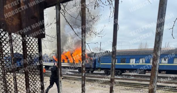 Зокрема, інформація з’явилася у Телеграм-каналі «Новини Миколаєва». На відео видно, як в одному з вагонів після удару спалахнула пожежа. Її вже вдалося ліквідувати рятувальникам.