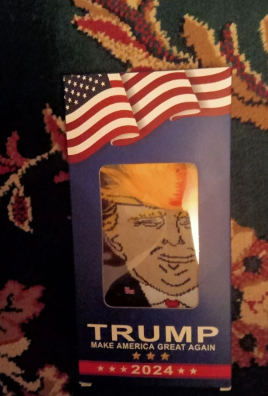 На фото, які він надав пропагандистам, – пара чорних шкарпеток із червоними носочками. На кожному з них прикріплені яскраві жовті пасма, злегка розпатлані й підняті, які створюють ефект "вихору" або зачіски, яка "злітає", що дуже схоже на характерний стиль Трампа.