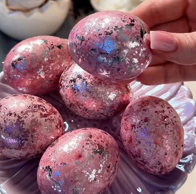 Змащуємо рукавичку білком від яйця і кладемо в руку сусальне золото або поталь. Беремо яйце і протираємо кілька разів у руці, аби золото рівномірно розподілити. Виходять неймовірно яскраві та красиві крашанки на Великдень.