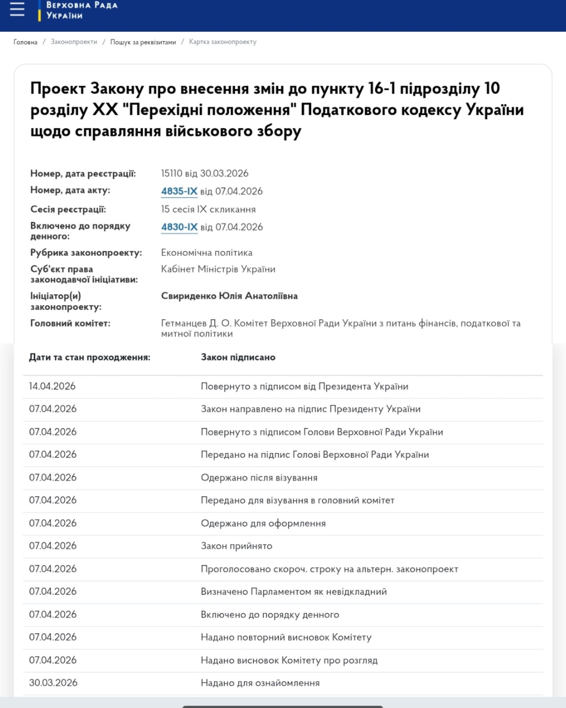 Йдеться про зміни до Податкового кодексу України, зокрема до пункту 16-1 підрозділу 10 розділу XX «Перехідні положення», що регулює порядок справляння військового збору.