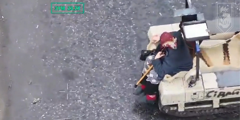 Бабуся виконувала всі команди військових. Вона дійшла до робота, сіла на нього і витримала увесь шлях до військових, які її забрали в укриття.